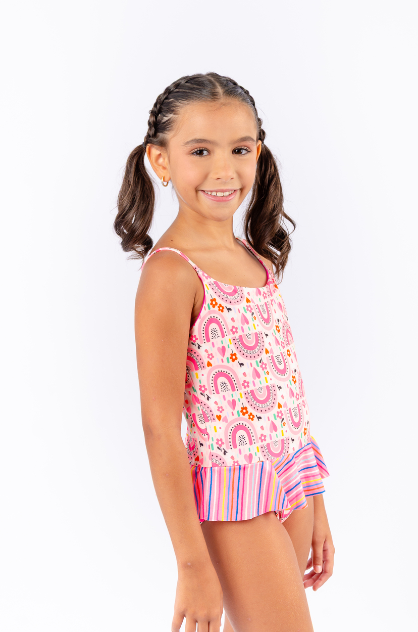 O maiô modelo M265a da Salaminakids foi projetado para oferecer o máximo de conforto e liberdade de movimentos. Com uma modelagem inteira que se ajusta perfeitamente ao corpo infantil, esta peça une a delicadeza dos babados à mais alta tecnologia de proteção solar.